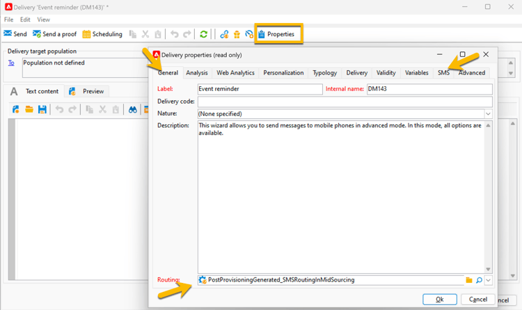 필요에 따라 모두 설정된 Properties 단추를 확인할 수 있습니다. SMS 탭에 대해 자세히 알아보기