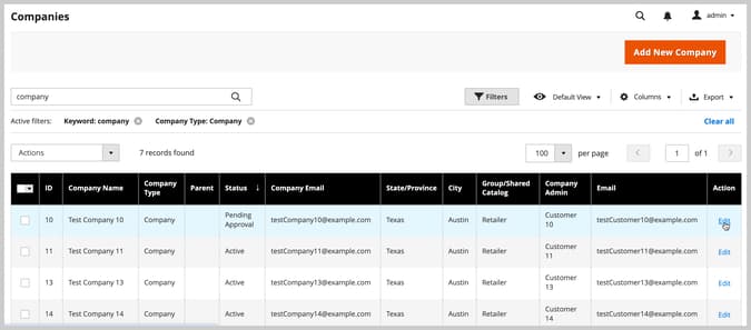 그리드에서 회사를 찾은 다음 Action열에서 Edit 을(를) 클릭합니다.