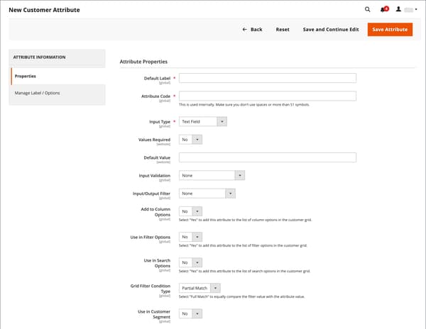 Text Field- 한 줄 텍스트 필드입니다.Text Area - 여러 줄 텍스트 영역입니다.Multiple Line- 여러 줄 주소(여러 줄 주소)와 유사하게 특성에 대해 여러 텍스트 줄을 만듭니다. 개별 데이터 입력 라인의 수는 2개에서 20개까지 지정할 수 있습니다.Date - 팝업 달력이 있는 날짜 필드를 표시합니다.Dropdown- 하나의 값만 선택할 수 있는 드롭다운 목록입니다.Multiple Select - 여러 값을 선택할 수 있는 드롭다운 목록입니다.Yes/No- Yes 또는 No 값을 선택할 수 있는 필드입니다.File (attachment) - 파일을 업로드하고 고객 특성과 연결할 수 있는 필드입니다.Image File- 갤러리에 이미지를 업로드하고 고객 특성과 연결할 수 있는 필드입니다.Yes / NoNone- 데이터 입력 중에 필드에 입력 유효성 검사가 없습니다.Alphanumeric - 데이터를 입력하는 동안 숫자(0-9)와 영문자(a-z, A-Z)의 조합을 사용할 수 있습니다.Alphanumeric with Space- 거리 주소의 공백이 통신사의 최대 길이 요구 사항을 준수하도록 허용합니다. 체크아웃 시 고객은 수신자 및 발신자의 거리 주소에 숫자(0-9), 알파벳 문자(a-z, A-Z) 및 공백의 조합을 입력할 수 있습니다. 주소를 저장하면 추가 공백이 트리밍됩니다.Numeric Only - 데이터를 입력하는 동안 숫자(0-9)만 허용합니다.Alpha Only- 데이터를 입력하는 동안 영문자만 허용합니다(a-z, A-Z).URL - 데이터를 입력하는 동안 URL만 허용합니다.Email- 데이터를 입력하는 동안 전자 메일 주소만 허용합니다.Length Only - 필드에 입력한 데이터의 길이를 기반으로 입력의 유효성을 검사합니다.None- 필드에 입력한 텍스트에 필터를 적용하지 않습니다.Strip HTML Tags - 텍스트에서 HTML 태그를 제거합니다. 이 필터는 HTML 태그가 포함된 다른 소스의 필드에 붙여넣은 데이터를 정리하는 데 도움이 될 수 있습니다.Escape HTML Entities- 텍스트에 있는 특수 문자를 유효한 HTML 이스케이프 시퀀스(예: amp;)로 변환합니다. 이스케이프 시퀀스는 앰퍼샌드와 세미콜론 사이에 있으며, 타이포그래퍼의 스마트 따옴표, 저작권 기호 및 상표 기호에 자주 사용됩니다. 이스케이프 시퀀스를 사용하여 보다 작음(<) 및 보다 큼(>) 기호, 코드에서도 사용되는 앰퍼샌드 문자 등의 문자를 식별합니다. 이 필터는 워드 프로세서에서 데이터베이스 필드에 붙여넣는 특수 문자를 정리하는 데 도움이 될 수 있습니다.Yes / NoPartial Match / Prefix Match / Full MatchYes / NoStorefront Properties