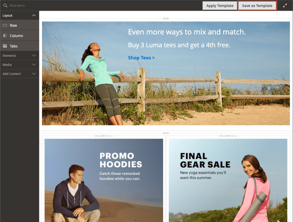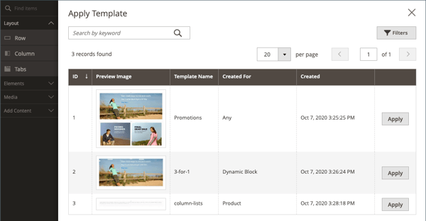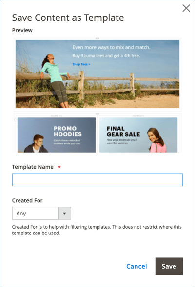 템플릿은 Page Builder 콘텐츠와 기존 페이지, 블록, 동적 블록, 제품 특성 및 범주 설명의 레이아웃을 저장하는 컨테이너입니다. 템플릿을 사용하면 콘텐츠를 만들거나 이전 콘텐츠를 바꿀 때 시간과 노력을 절약할 수 있습니다. 예를 들어 기존 Page Builder 콘텐츠를 템플릿으로 저장한 다음 해당 템플릿(모든 콘텐츠 및 레이아웃 포함)을 다른 영역에 적용하여 Page Builder 콘텐츠를 빠르게 만들 수 있습니다.