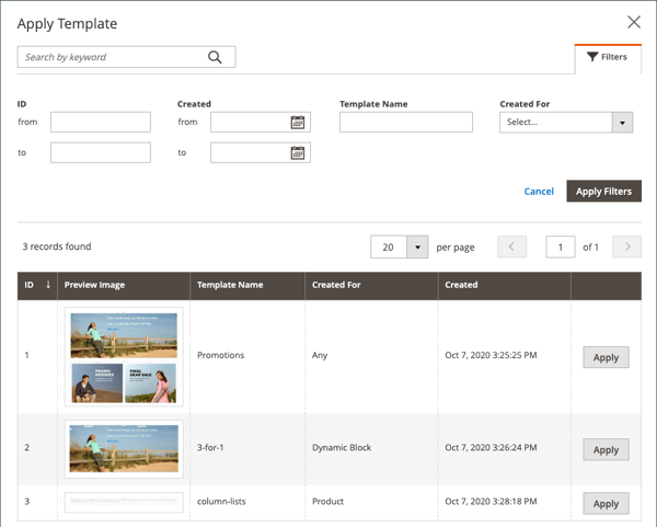 Apply Template그리드에서 템플릿을 선택하고 행 끝에 있는 Apply 을(를) 클릭합니다.