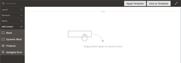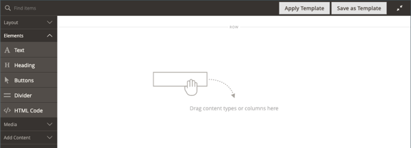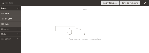 기본적으로 Page Builder 단계는 비어 있습니다. 패널에서 스테이지로 레이아웃 콘텐츠 유형을 드래그할 때 페이지의 다른 레이아웃 컨테이너 위, 아래 또는 내부에 배치할 수 있습니다. 행은 스테이지에 직접 추가될 수만 있습니다.