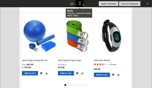 모바일 — 미리 정의된 너비 768픽셀로 콘텐츠 미리 보기를 표시합니다. 데스크탑 뷰포트와 달리 모바일 뷰포트에는 768픽셀(최대) 및 640픽셀(최소)의 중단점 너비에 대해 정의된 스타일과 함께 768픽셀 너비의 페이지 콘텐츠가 표시됩니다.