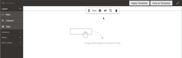 Layout패널의 Page Builder 섹션은 행, 열 또는 탭을 단계에 추가하는 데 사용됩니다. 패널에서 스테이지로 콘텐츠 유형을 드래그하면 콘텐츠 유형에 해당하는 옵션 도구 상자가 있는 컨테이너가 나타납니다.