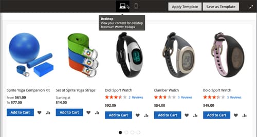 데스크톱 — 미리 정의된 너비 없이 콘텐츠 미리 보기를 표시합니다. 데스크탑 정의 스타일(중단점 최소 너비 1024픽셀 사용)은 여전히 페이지에 적용됩니다. 그러나 데스크톱 뷰포트 너비는 행과 같은 컨테이너 콘텐츠 유형에 대한 설정으로 정의됩니다. 데스크탑 뷰포트를 선택하면 브라우저 페이지 너비가 1024픽셀 이상일 때 컨텐츠가 상점 첫 화면에서 어떻게 스타일링되는지 보여줍니다.