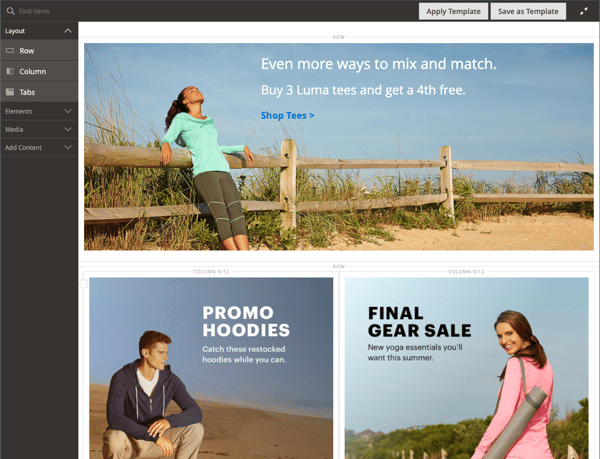 미리 보기에서 Page Builder 작업 영역을 열면 스테이지는 콘텐츠를 만들고 형식을 지정하며 라이브 콘텐츠를 빠르게 편집할 수 있는 기본 작업 영역입니다. 스테이지는 처음에 비어 있으며 왼쪽 패널에서 행, 열 및 탭을 드래그할 수 있는 디자인 화면을 제공합니다.