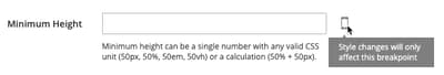 뷰포트 버튼은 선택한 뷰포트를 기반으로 다양한 중단점 스타일을 콘텐츠 유형에 적용하는 옵션을 제공합니다. 기본적으로 Page Builder은(는) 행, 열, 탭, 탭 항목, 배너, 슬라이더 및 슬라이드의 Minimum Height필드에 대한 중단점 설정을 제공합니다. 모바일 뷰포트를 선택한 다음 이러한 컨텐츠 유형 중 하나에 대한 편집기를 열면 모바일 뷰포트 중단점과 관련된 필드 값을 입력할 수 있습니다. 특정 중단점 설정을 허용하는 콘텐츠 유형 필드는 행의 다음 예제와 유사하게 필드 오른쪽에 아이콘을 표시합니다.