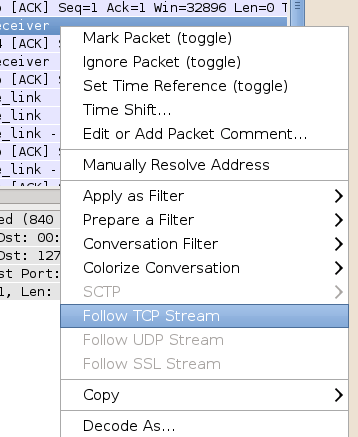 TCP 스트림 팔로우 도구를 사용하여 작업 중인 스트림을 분리합니다.