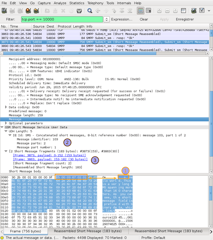 위의 스크린샷에는 메시지 필드의 사용자 데이터 헤더(1), UDH에 포함된 정보(2), 패킷에 속하지 않지만 Wireshark가 계산한 추가 정보(3)가 표시됩니다. 짧은 메시지 본문 필드는 Wireshark에서 다시 조립한 전체 메시지가 포함되어 있어 매우 흥미롭습니다.