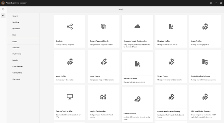 Dynamic Media 일반 설정 페이지를 열려면 AEM 작성자 인스턴스에서 도구 를 클릭한 다음 Assets(으)로 이동한 다음 Dynamic Media 일반 설정(으)로 이동합니다.