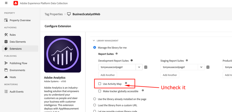AEP 데이터 수집(Launch) UI에서 Adobe Analytics 확장 구성을 선택하고 상자를 선택 취소하여 Activity Map을 비활성화한 다음 빌드를 게시합니다.