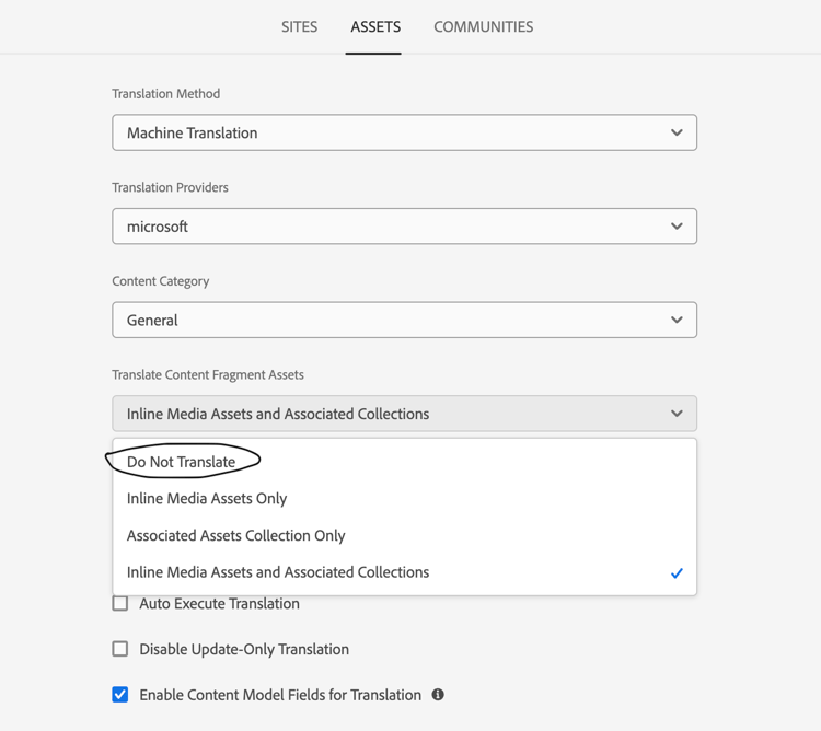 이 문서에서는 콘텐츠 조각의 CF(콘텐츠 조각) 참조가 사본의 언어와 일치하도록 자동으로 조정되지 않는 문제를 해결하는 방법을 설명합니다. 이 문제는 콘텐츠 조각 Assets 번역 옵션을 번역하지 않음 에서 인라인 미디어 Assets 및 관련 컬렉션(으)로 변경하여 해결할 수 있습니다.