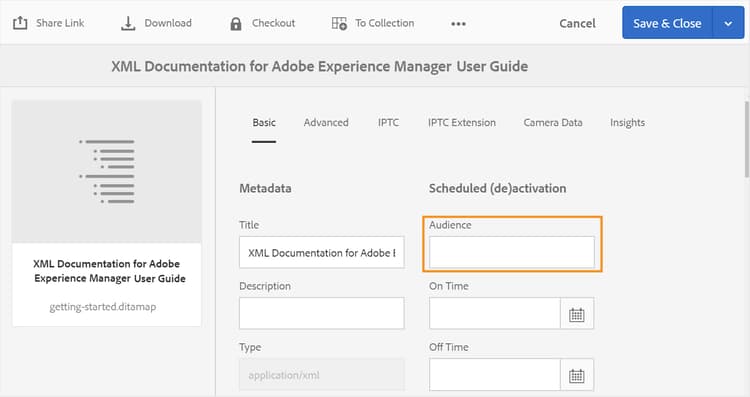 속성에 매핑 설정에서 을(를) 지정합니다./jcr:content/metadata/<메타데이터의 이름>. 이 예제에서는 를 로 설정합니다./jcr:content/metadata/audience