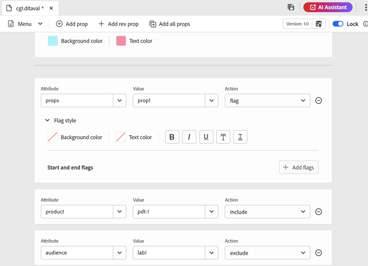 DITAVAL 파일 작성에 대한 플래그 지정 지원 향상: Experience Manager Guides은 DITAVAL 파일의 향상된 플래그 지정 지원을 통해 콘텐츠 게시를 사용자 지정할 수 있는 새로운 기능을 제공합니다. 이제 이미지를 포함하여 특정 콘텐츠 주위에 시작 및 종료 플래그를 적용하고 굵게, 기울임체 등의 서식 옵션을 사용하여 플래그가 지정된 섹션을 보강할 수 있습니다. 조건 중복을 처리하기 위해 스타일 충돌 을 구성할 수 있습니다. 여기에는 기본 배경색과 텍스트 색 설정, 출력의 명확성과 일관성이 포함됩니다. 이러한 플래그는 기본 PDF 생성에서 완전히 지원되며, 결과 출력은 적용된 모든 스타일 요소를 정확하고 종합적으로 반영합니다.