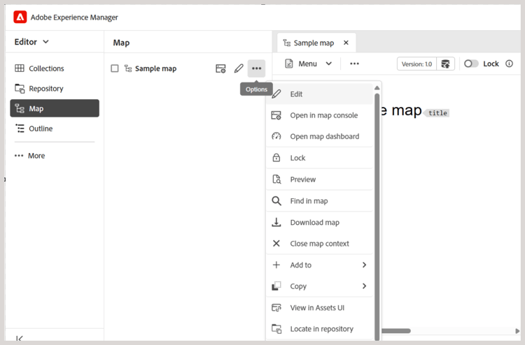 Adobe Experience Manager 저장소에 DITA 맵 파일이 있으면 해당 종속 항목과 함께 맵 파일을 다운로드할 수 있습니다. 이렇게 하면 오프라인 편집, 유효성 검사, 검토 또는 간단히 백업을 만들 수 있도록 전체 맵 파일을 유연하게 공유할 수 있습니다.