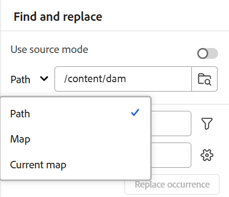 맵의 옵션 메뉴에서 맵에서 찾기 옵션을 사용하여 맵에서 텍스트를 찾아 바꿀 수도 있습니다. 이 옵션은 저장소 패널 또는 맵 보기에서 연 맵에 대해 나타납니다.