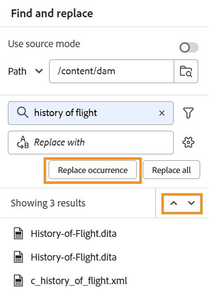 note note NOTE then 모두 바꾸기 아이콘을 활성화하려면 폴더 프로필 관리자 또는 시스템 관리자가 Workspace 설정(준비 시에 설정 표시)의 일반 탭에서 모두 바꾸기 옵션을 선택해야 합니다. 바꾸기 작업 중에 오류가 발생하면 XML 구문 분석 문제 또는 DITA 관련 오류로 인해 해당 파일을 건너뜁니다. {width="350"}