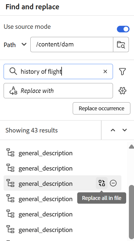 - 검색 결과 사용: Adobe Experience Manager 저장소의 선택한 경로에 있는 파일에서 일부 텍스트를 검색합니다. 텍스트는 파일의 제목, 파일 이름 및 콘텐츠에서 검색됩니다.