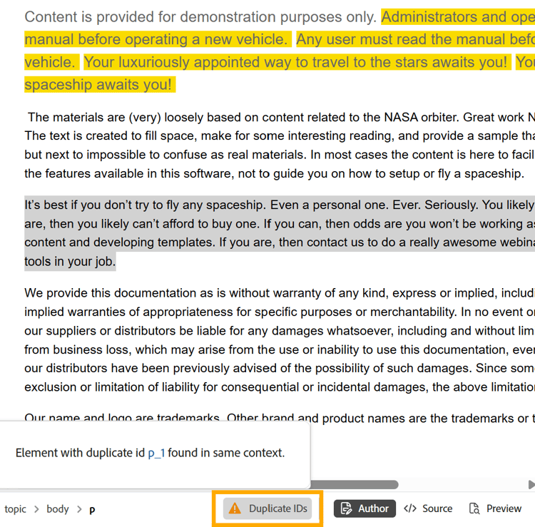 - 경고 메시지는 DITA 파일에만 사용할 수 있으며 작성자, Source 및 레이아웃과 같은 모든 보기에서 볼 수 있습니다.