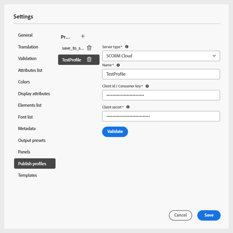 여러 SCORM Cloud 계정에 게시해야 하는 경우 여러 프로필을 만들 수 있으므로 게시 프로세스를 유연하고 제어할 수 있습니다.