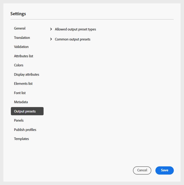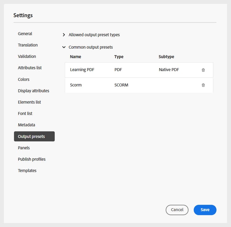 [출력 사전 설정] 탭에서는 과정을 게시하는 데 사용할 수 있는 출력 형식을 정의할 수 있습니다. 여기에는 허용된 출력 사전 설정 유형 및 일반적인 출력 사전 설정의 두 섹션이 포함되어 있습니다.