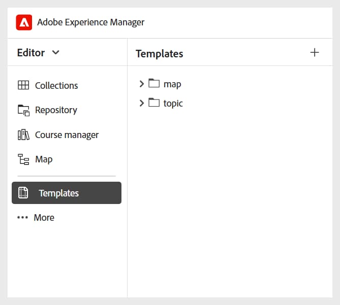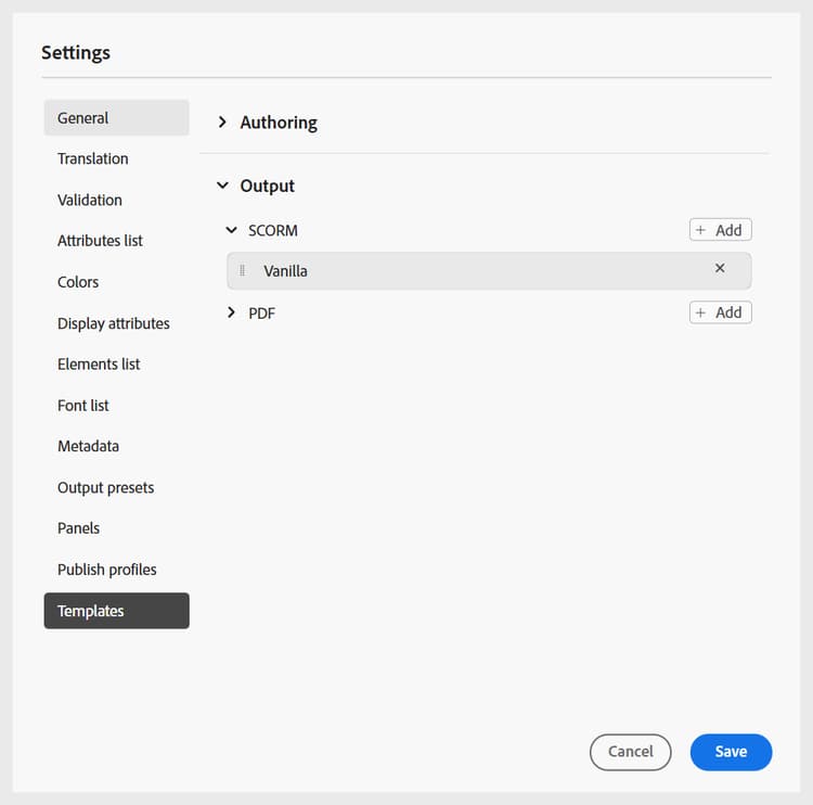 이 설정을 사용하면 편집기의 왼쪽 패널에 있는 작성 및 게시 템플릿을 관리할 수 있습니다. 작성 및 출력 템플릿을 추가, 제거 또는 재정렬하여 작성자 및 게시자가 액세스할 수 있습니다.