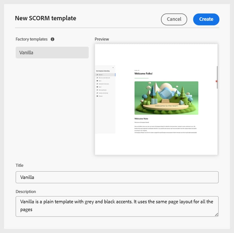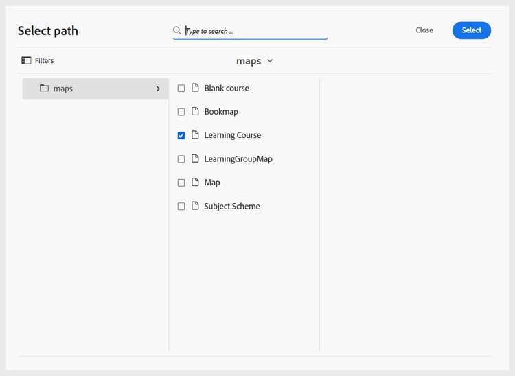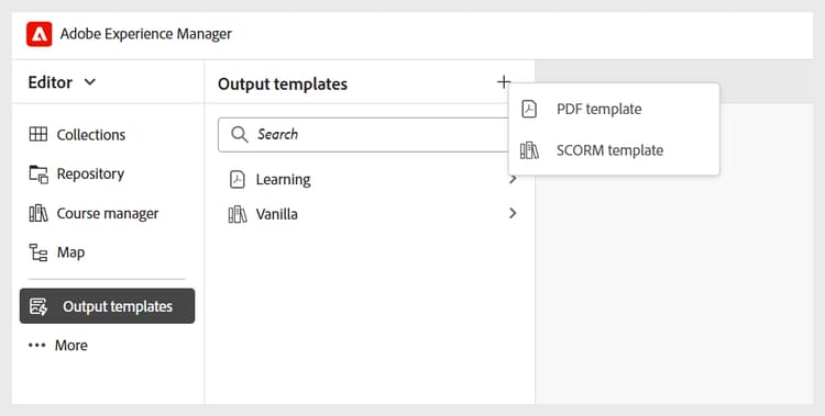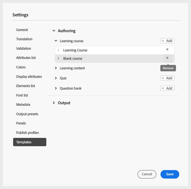 마찬가지로 다른 작성 및 출력 템플릿을 추가할 수 있습니다. 이 템플릿을 추가하면 작성자 및 게시자는 해당 과정 대화 상자에서 해당 템플릿을 사용할 수 있습니다. 예를 들어 관리자가 추가한 학습 과정 템플릿은 작성자가 새 과정을 만들 때 사용할 수 있습니다.