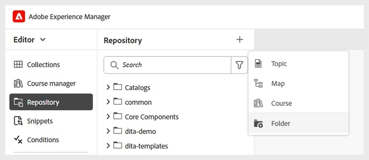 작성 및 출력 템플릿을 관리하기 위해 다른 폴더를 만듭니다: 엔터프라이즈의 다른 부서나 제품에서 작업하는 작성자와 게시자를 위한 폴더를 만들 수 있습니다. 이러한 폴더는 부서별 학습 과정 작성 및 분산 관리를 지원하기 위해 각기 다른 작성 및 출력 템플릿으로 구성된 특정 폴더 프로필에 매핑할 수 있습니다.