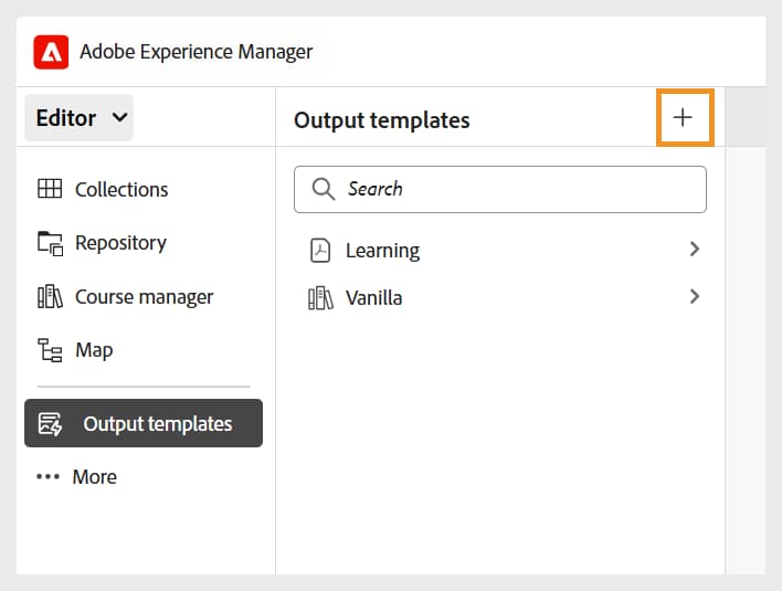 게시자용 출력 템플릿에 액세스하여 추가하려면 설정 > 템플릿 > 출력 템플릿으로 이동한 다음 추가를 선택합니다.