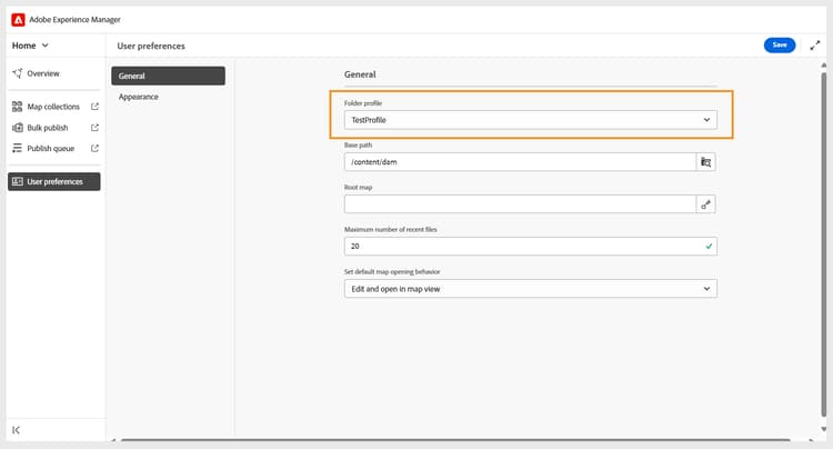 구성할 폴더 프로필 선택: 폴더 프로필이 만들어지면 사용자 환경 설정 페이지에서 폴더 프로필을 선택하여 작성자와 게시자가 올바른 템플릿에 액세스할 수 있도록 해야 합니다.