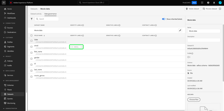 Show Inherited Labels 토글이 기본적으로 설정되어 스키마에서 해당 필드로 상속된 모든 레이블을 볼 수 있습니다. 토글을 끄면 데이터 세트 내에 상속된 모든 레이블이 숨겨집니다.