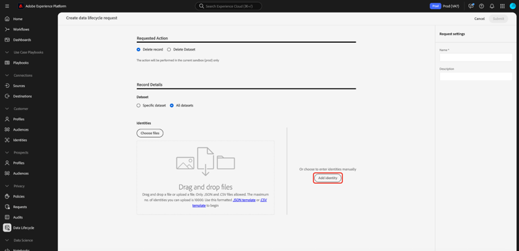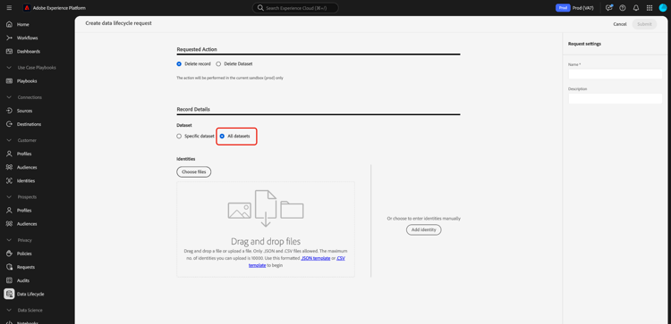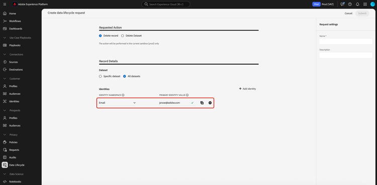 Data Lifecycle 작업 영역을(를) 사용하여 기본 ID를 기반으로 Adobe Experience Platform에서 레코드를 삭제합니다. 이러한 레코드는 개별 소비자 또는 ID 그래프에 포함된 다른 엔티티에 연결할 수 있습니다.