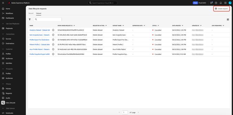 프로세스를 시작하려면 Experience Platform UI의 왼쪽 탐색에서 Data Lifecycle을(를) 선택합니다. Data lifecycle requests 작업 영역이 나타납니다. 작업 영역의 기본 페이지에서 Create request을(를) 선택합니다.