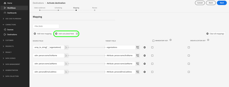 array_to_string 함수를 사용하여 필드를 문자열로 연결해야 합니다.클라우드 저장소 대상에 대한 활성화 워크플로의 매핑 단계에서 계산된 필드 추가 를 선택합니다.