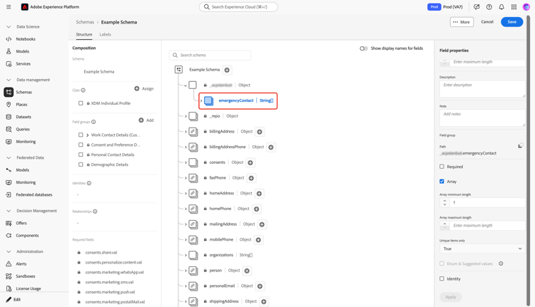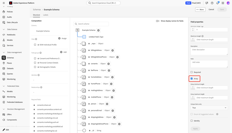 이 안내서에서는 UI에서 배열 필드를 정의하는 방법을 다룹니다. Schema Editor에서 다른 XDM 필드 유형을 정의하는 방법을 알아보려면 UI의 필드 정의에 대한 개요를 참조하십시오.