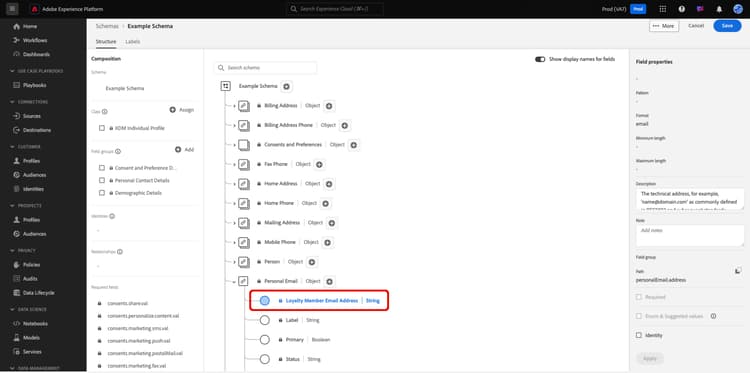 변경 사항을 적용하면 표준 개체 내의 테넌트 ID 네임스페이스 아래에 새 필드가 표시됩니다. 이 중첩된 네임스페이스는 동일한 필드 그룹을 사용하는 다른 스키마의 변경 사항을 방지하기 위해 필드 그룹 자체 내에서 필드 이름 충돌을 방지합니다.