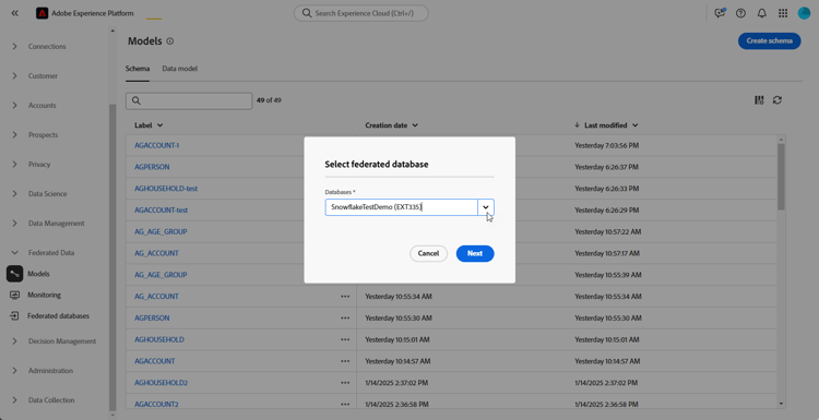 통합 데이터베이스의 테이블은 업데이트, 추가 또는 제거할 수 있습니다. 이러한 경우 최신 변경 사항에 맞게 Adobe Experience Platform에서 스키마를 새로 고쳐야 합니다. 이렇게 하려면 스키마 이름 옆에 있는