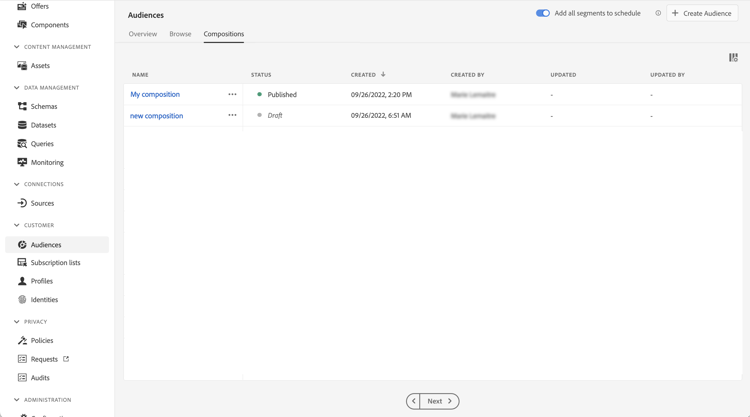 대상자 컴포지션 기능은 Adobe Journey Optimizer의 대상자 메뉴에서 액세스할 수 있습니다.