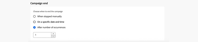캠페인 끝 섹션에서 캠페인 실행을 중지해야 하는 시기를 지정할 수 있습니다. 지정한 날짜 외에는 캠페인이 실행되지 않습니다.