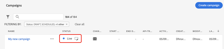 캠페인 목록에서 진행 중인 초안 버전의 활성화된 캠페인이 상태 열에 특정 아이콘과 함께 표시됩니다. 이 아이콘을 클릭하여 캠페인의 초안 버전을 엽니다.