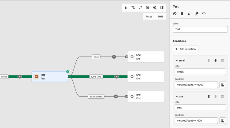 오케스트레이션된 캠페인 실행 중에 각 조건은 조건 중 하나가 충족될 때까지 순차적으로 테스트됩니다. 조건이 충족되지 않으면 오케스트레이션된 캠페인이 기본 조건 의 경로를 따라 계속됩니다. 활성화된 기본 조건이 없으면 이 시점에서 캠페인이 중지됩니다.