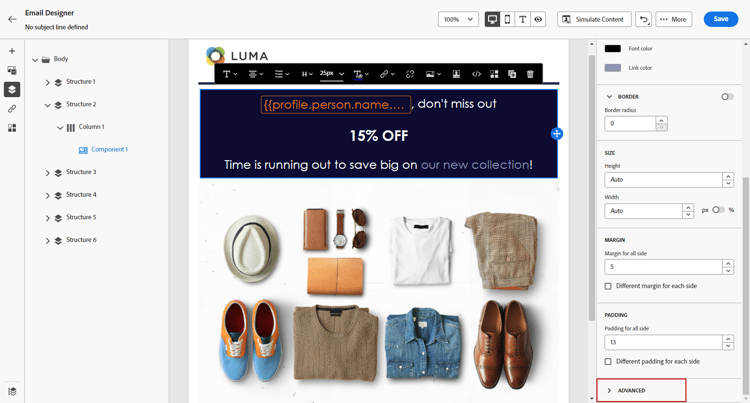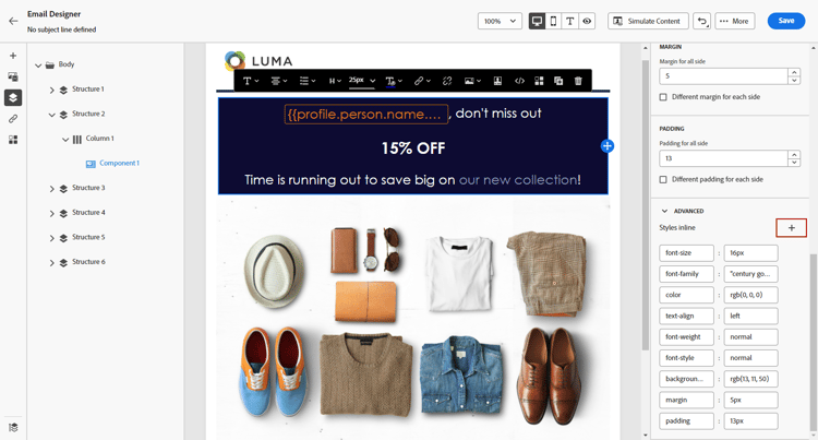 이메일 Designer 인터페이스에서 요소를 선택하고 사이드 패널에 해당 설정을 표시하면 해당 특정 요소에 대한 인라인 속성 및 해당 값을 사용자 지정할 수 있습니다.