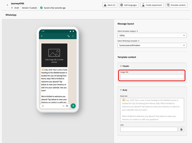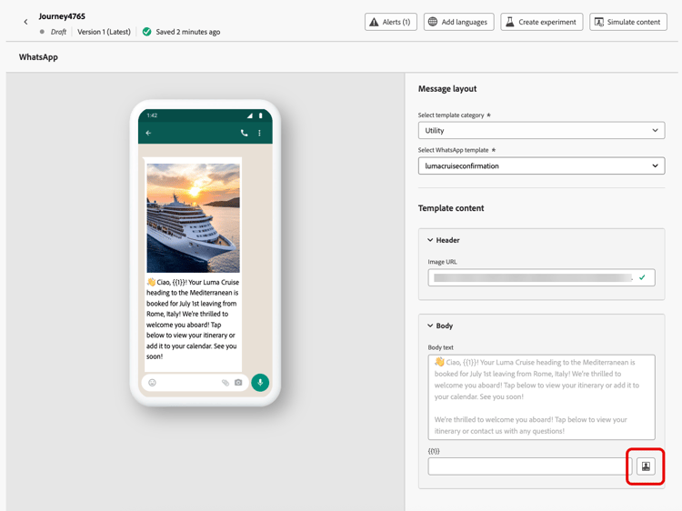 콘텐츠 시뮬레이션 단추를 사용하여 WhatsApp 메시지 콘텐츠, 단축된 URL 및 개인화된 콘텐츠를 미리 볼 수 있습니다. 자세히 알아보기