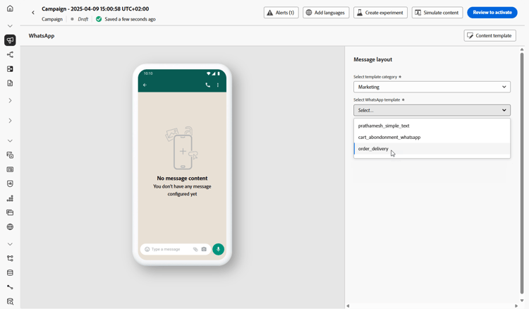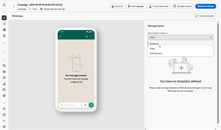 Journey Optimizer에서 WhatsApp 메시지를 디자인하기 전에 먼저 메타에서 템플릿을 만들고 디자인해야 합니다. 자세히 알아보기