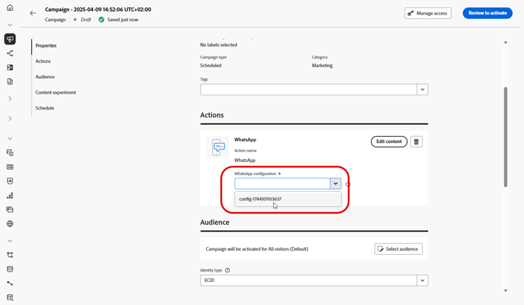 작업 섹션에서 WhatsApp 을(를) 선택하고 새 구성을 선택하거나 만드십시오.