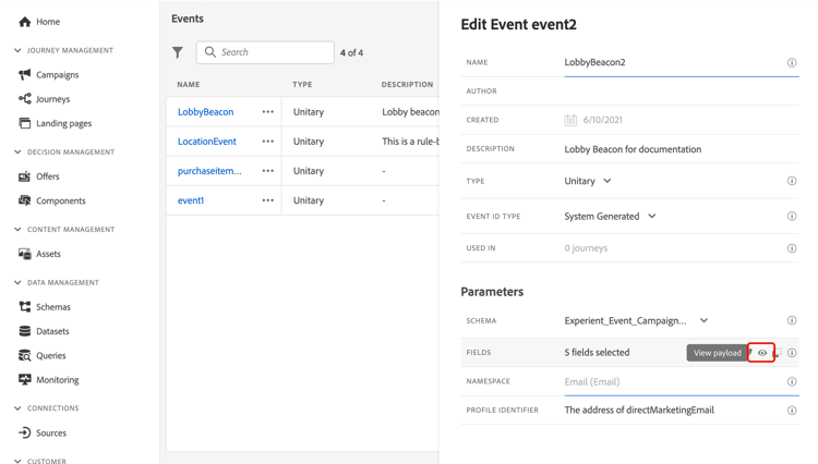 note note NOTE 시스템 생성 이벤트의 경우 에서 이벤트를 식별할 수 있도록 선택한 필드 목록에 eventIDJourney Optimizer 필드가 자동으로 추가됩니다. 이벤트를 푸시하는 시스템은 ID를 생성하지 않아야 하며 페이로드 미리 보기에서 사용할 수 있는 ID를 사용해야 합니다. 이 섹션을 참조하십시오. -