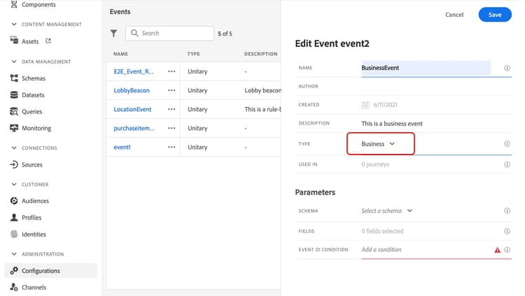 - 비즈니스 이벤트는 단일 이벤트 또는 대상자 선별 활동과 함께 사용할 수 없습니다.
