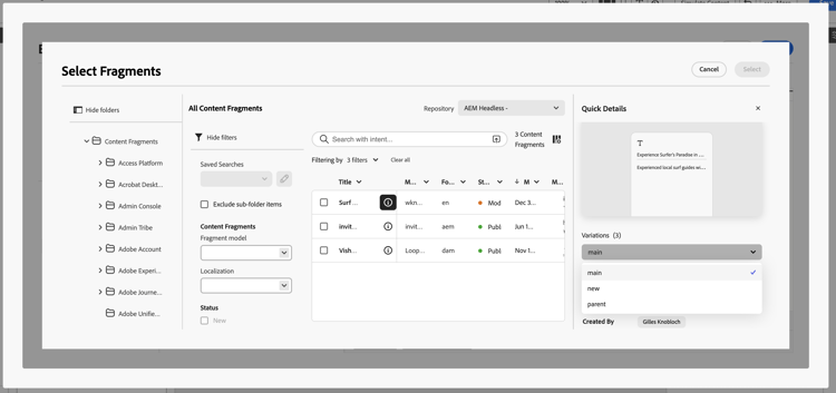 note note NOTE 조각에 하나 이상의 게시 변형이 있는 경우 선택기에 변형 드롭다운이 표시됩니다. 변형을 선택하지 않으면 Main 변형이 자동으로 사용됩니다. 콘텐츠 조각 변형을 사용하여 작업에서 자세히 알아보세요. -