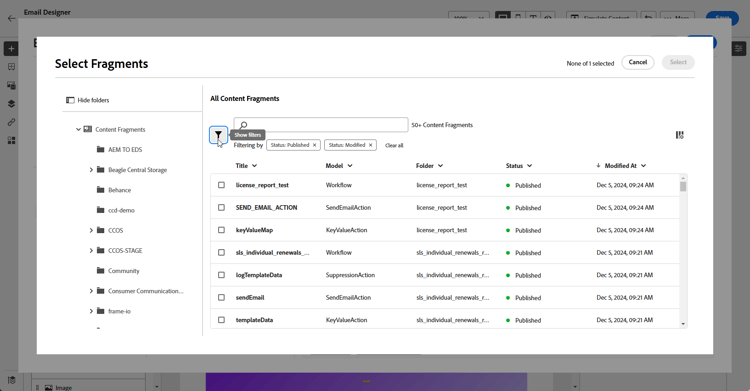 목록을 탐색하고 Journey Optimizer 콘텐츠로 가져올 콘텐츠 조각을 선택하십시오.