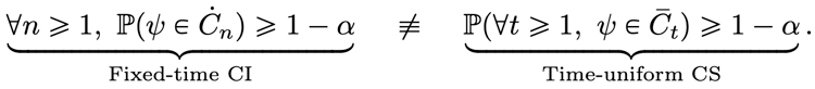 실험에서 변형의 전환율과 같은 대상 매개 변수 ψ을(를) 추정하려는 경우 '고정 시간' 신뢰 구간(CI) 시퀀스와 시간 균일 신뢰 시퀀스(CS) 간의 이분법은 다음과 같이 요약할 수 있습니다.